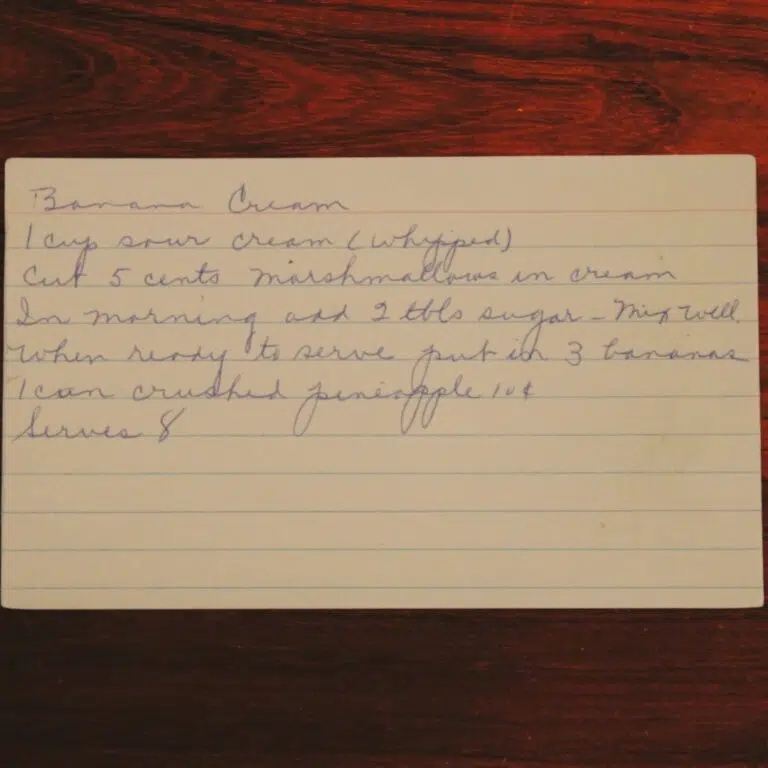 This is a fun and easy vintage recipe with bananas, marshmallows, sour cream and pineapples. Note the 5 and 10 cent prices on the card for the ingredients!
