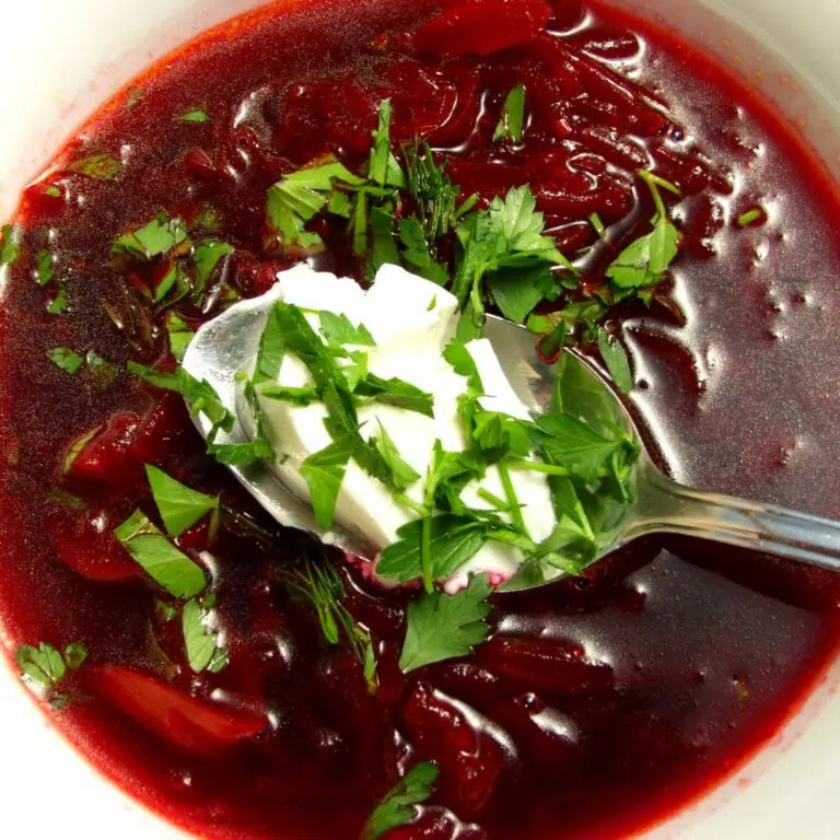 Ladle the borscht into bowls and top each serving with a dollop of sour cream.