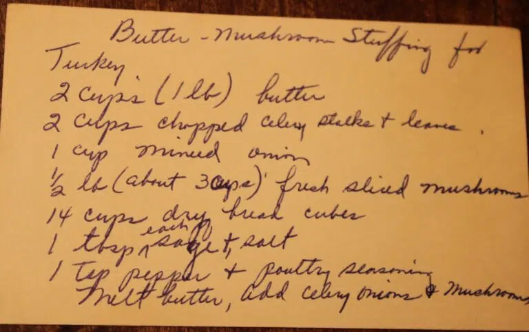 This tried-and-true stuffing recipe has been handed down several generations. Bread cubes, buttery mushrooms, celery for a bit of crunch.