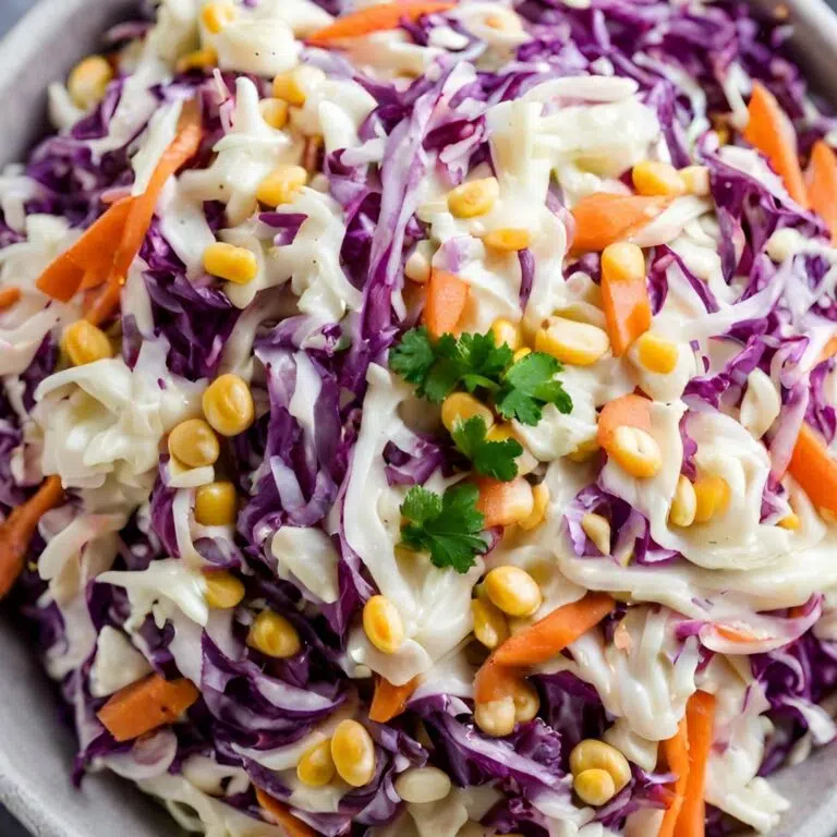 This Goddess Slaw Salad uses Goddess Sauce, red cabbage, shredded carrots, corn, bean sprouts and onions for a fresh twist on a classic dish. Top with fresh chopped dill.