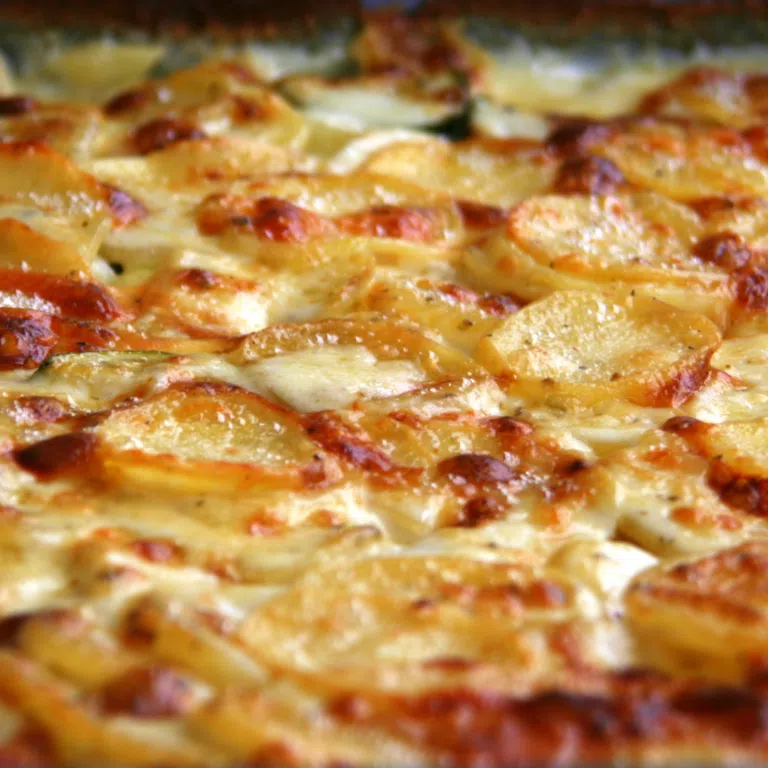 - Layer the potatoes, both cheeses, and the milk mixture into the prepared baking dish, until all are used up.