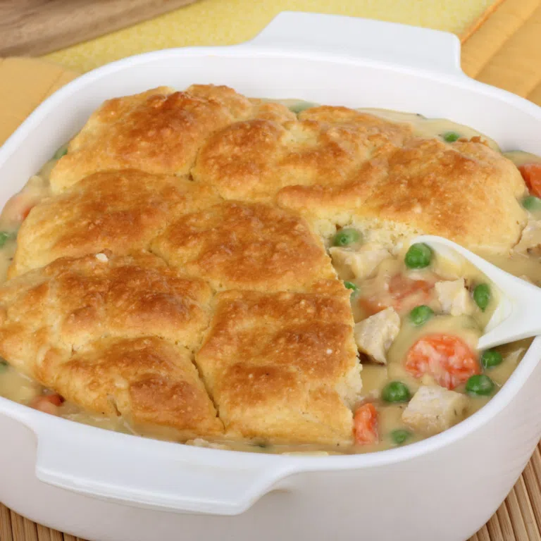 A creamy turkey and veggie filling topped with fluffy biscuits, baked to golden perfection.