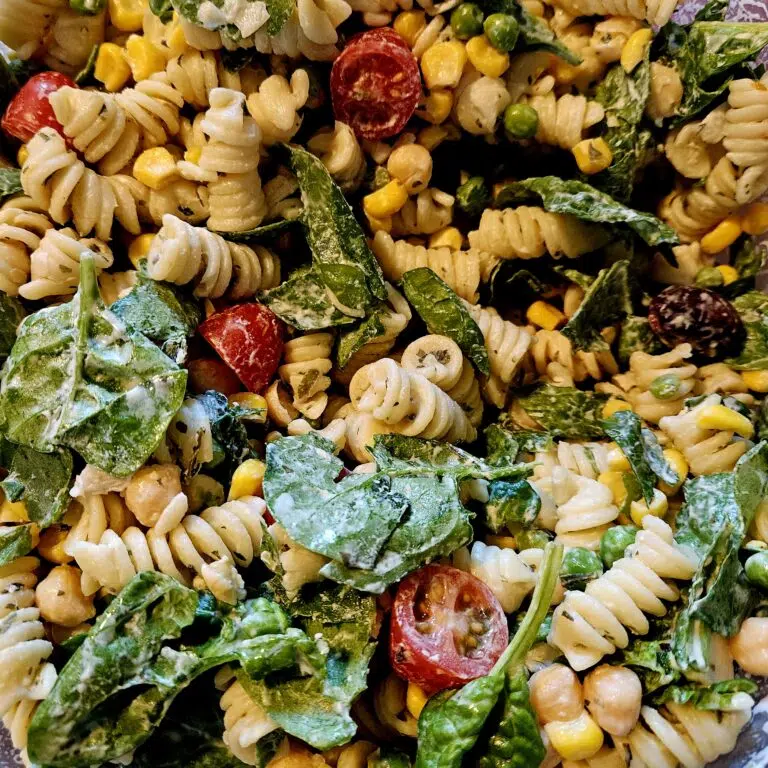A nice summertime pasta salad using rotini pasta, Tzatziki, fresh spinach, cherry tomatoes, kalamata olives, sweet peas, corn and chick peas. Crumble some feta or add your favourite cubed cheese. I make this and store in the fridge for an easy meal.